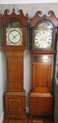 Longcase Clocks- on the left is a 30-hour clock. On the right an 8-day Joseph Kern. Both pieces mid 19th Century. Clock on the left £350 Clock on the right £950.